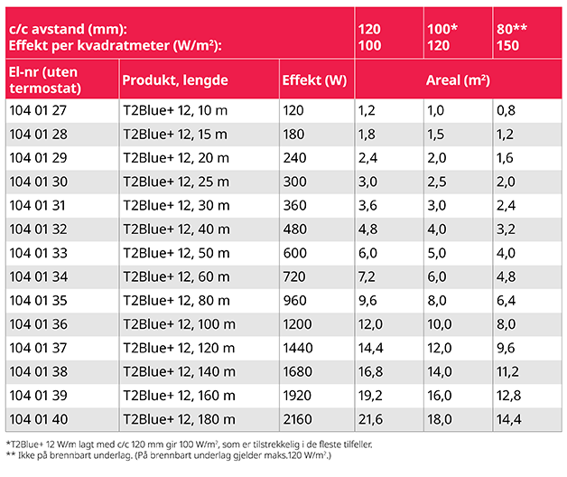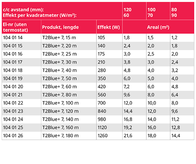 T2Blue+ er en elektrisk gulvvarmekabel med konstant utgangseffekt. Det er en forhåndsterminert, 2-leder varmekabel med en 2,5 m lang kaldledning i den ene enden. Den enkle kabelen skal legges i et lag med sparkelmasse, men kan også monteres i membranen.